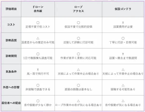 外壁打診調査をおこなう場合、ドローンなどを使用した赤外線調査、仮設ゴンドラを設置した調査、ロープを使った調査の方法などがあります。