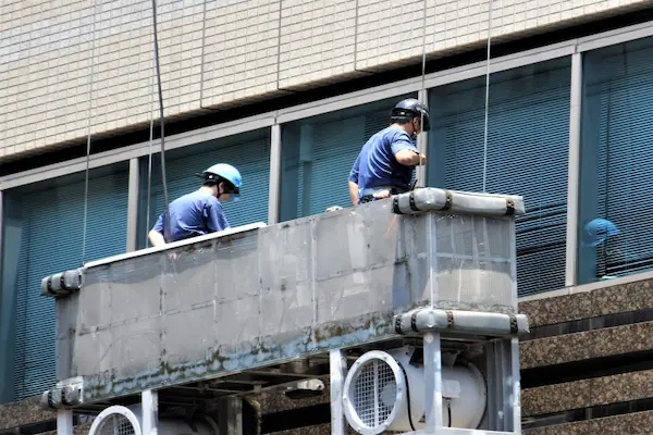 屋上側に機材を設置し、ゴンドラを吊り下げて昇降しながら近接作業を行う方法です。屋上のスペースや強度、建物形状によっては設置が難しい場合があります。